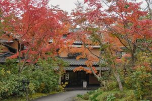 11月12日現在、玄関前では紅葉が見頃を迎えており、真紅や橙に色づいた木々が訪れるお客様をあたたかく迎えております。